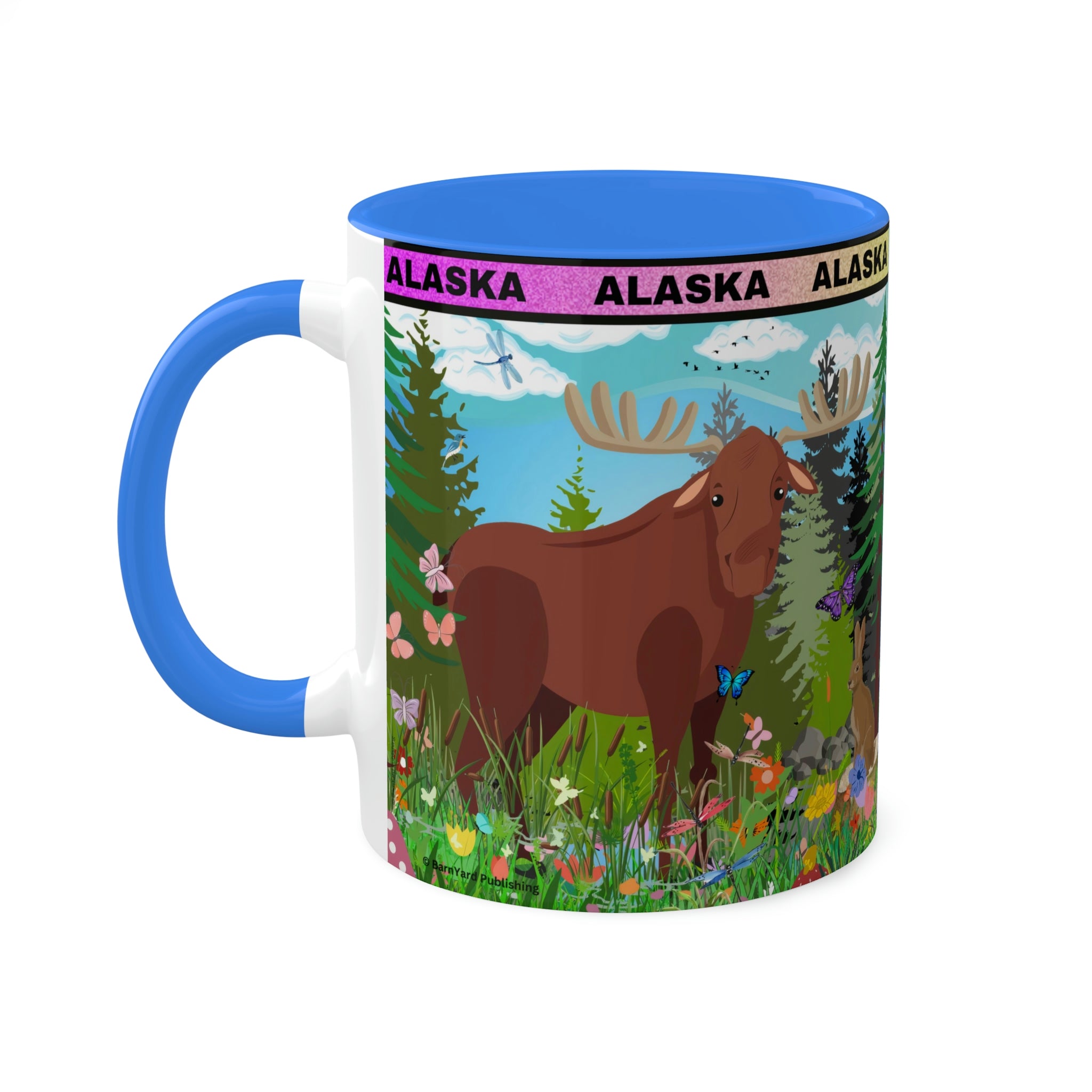 Our in-house designer at BarnYard Publishing made this fun Alaska design. It shows some of our favorite animals and characters, like an Eskimo, a moose, a rabbit, and a whale.